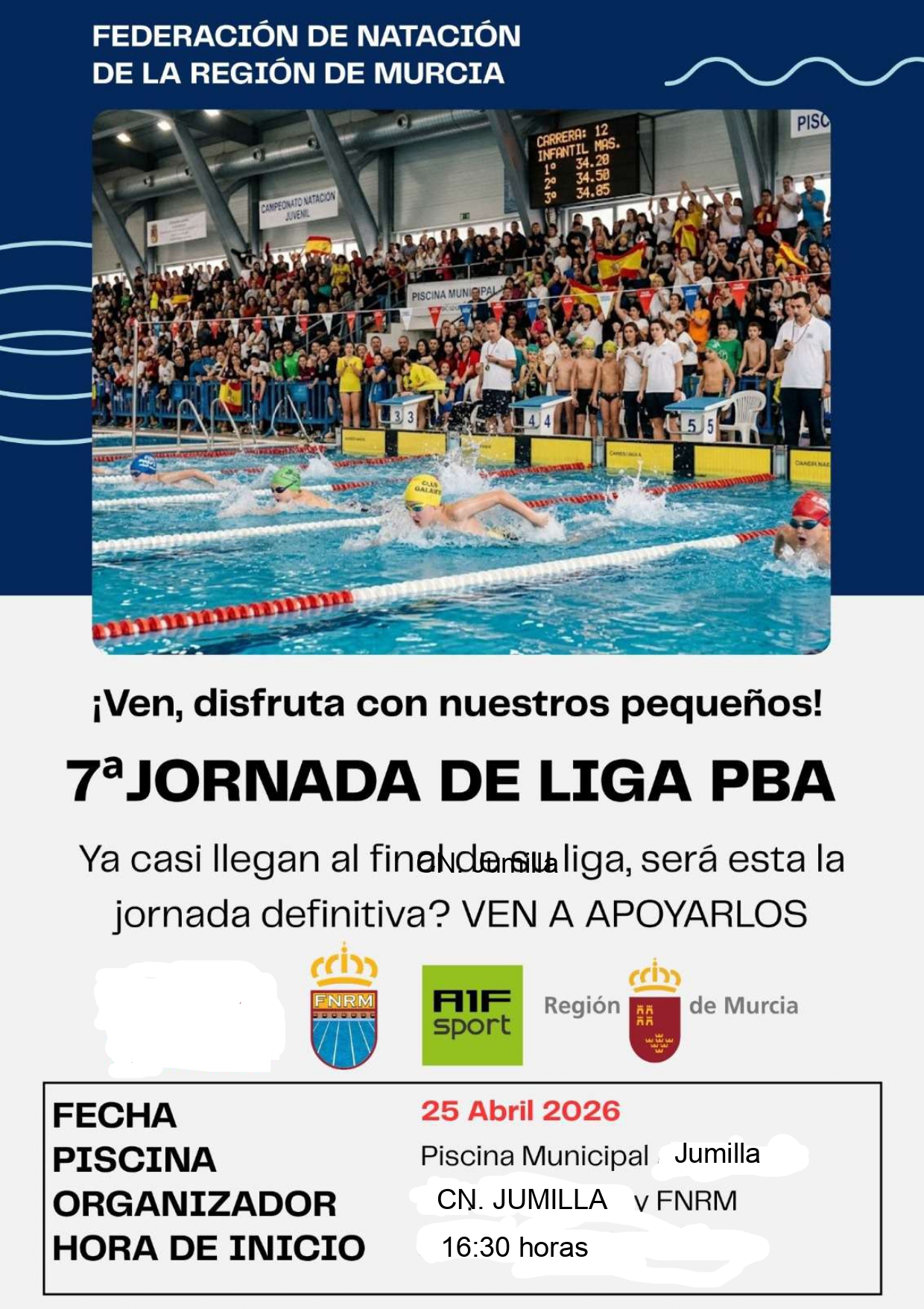 3 eventos encontrados. Eventos Navegación de búsqueda y vistas de Eventos Buscar Introduce la palabra clave. Busca Eventos para la palabra clave. Buscar Eventos Navegación de vistas de Evento Lista Lista Mes Día Hoy Próximos Próximos Selecciona la fecha. abril 2026 Sáb 18 XX TROFEO DE NATACIÓN ANTONIO PICÓN abril 18 @ 10:00 am - 8:00 pm El Trofeo se celebrará el próximo sábado 18/04 en la Piscina Municipal San Antonio de Lorca. Normativa /Horario General Mañana /Horario General Tarde /Calentamiento / Deportistas: Listado inscritos Deportistas /SUMARIO […] Sáb 18 XIX CAMPEONATO REGIONAL OPEN DE NATACIÓN ARTÍSTICA REGIÓN DE MURCIA “MEMORIAL ALFONSO J. AZNAR” abril 18 @ 3:00 pm - abril 19 @ 3:00 pm El Regional Open de Natación Artística se celebrará los días 18 y 19 de abril en la piscina cubierta de Alhama de Murcia. PROGRAMA / INSCRIPCIONES /Resultados Oficiales / Sáb 25 7ª JORNADA DE LIGA PBA abril 25 @ 4:30 pm - 8:30 pm Normativa /Listado Inscritos /SUMARIO PROVISIONAL / Eventos anterior(es) Hoy Eventos siguiente(s) Suscribirse al calendario Google Calendar iCalendar Outlook 365 Outlook Live Exportar archivo .ics Exportar archivo .ics de Outlook